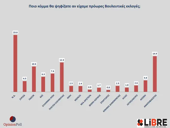 [Στην τελευταία δημοσιευμένη έρευνα της OPINION POLL για το ACTION 24 ( 22 Μαΐου) οι επιδόσεις των κομμάτων ήταν: Ν.Δ 30.4%, ΠΛΕΥΣΗ ΕΛΕΥΘΕΡΙΑΣ 16%, ΠΑΣΟΚ 13.5%, ΕΛΛΗΝΙΚΗ ΛΥΣΗ 9.6% , Κ.Κ.Ε 8.2% ,ΣΥΡΙΖΑ 5.8% , ΝΙΚΗ 3% , ΦΩΝΗ ΛΟΓΙΚΗΣ 2.9% , ΚΙΝΗΜΑ ΔΗΜΟΚΡΑΤΙΑΣ 2.9% , ΜΕΡΑ 25 2.4% , ΝΕΑ ΑΡΙΣΤΕΡΑ 1.2% , ΣΠΑΡΤΙΑΤΕΣ 1%, ΑΛΛΟ ΚΟΜΜΑ 3.4%.]
