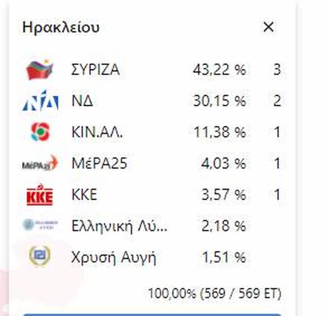 Ακολούθως, στο Ηράκλειο πρώτος αναδεικνύεται ο ΣΥΡΙΖΑ με 23,7%, ακολουθεί η ΝΔ με 22,8% ενώ το ΚΙΝΑΛ καταγράφει 21,6%