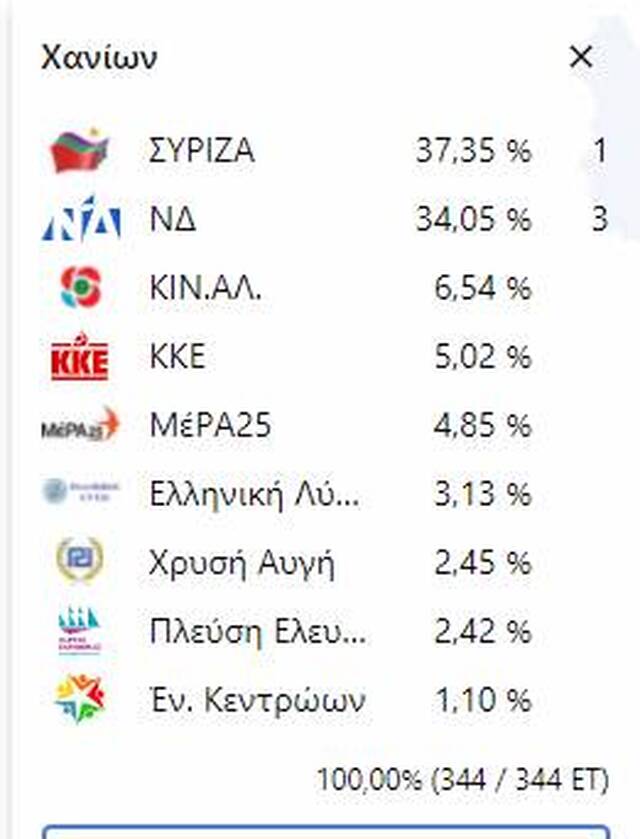 Συγκεκριμένα, στα Χανιά πρώτη αναδεικνύεται η ΝΔ με 27,5% ενώ ακολουθούν ο ΣΥΡΙΖΑ με 22,8% και το ΚΙΝΑΛ με 8,9%