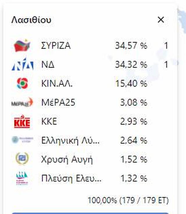 Τέλος στο Λασίθι η ΝΔ είναι επίσης πρώτη με 27,3% ο ΣΥΡΙΖΑ ακολουθεί με 20,4% και το ΚΙΝΑΛ με18,8%.