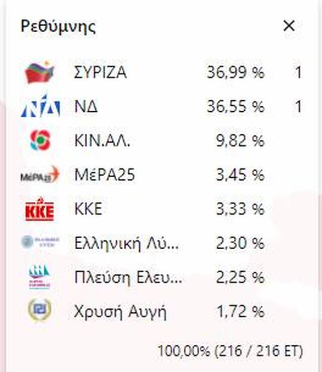 Στο Ρέθυμνο πρώτη τερματίζει η ΝΔ με 28,3%, ενώ ακολουθούν ΣΥΡΙΖΑ και ΚΝΑΛ με 22,2% και 19,6%.