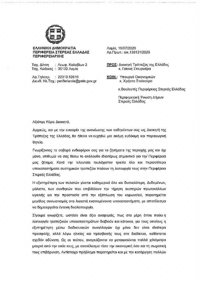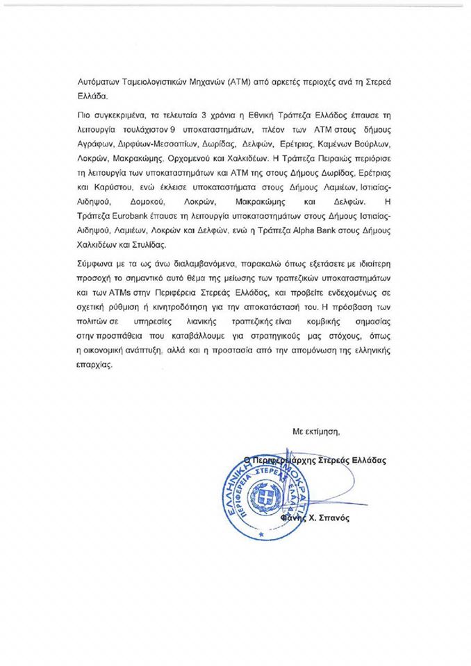 Επιστολή στον Διοικητή της Τράπεζας της Ελλάδας κ. Γιάννη Στουρνάρα, με θέμα το κλείσιμο καταστημάτων και την απομάκρυνση ATM’s όλων των συστημικώνΤραπεζών στα όρια της Περιφέρειας Στερεάς Ελλάδας κατά την τελευταία τριετία και τα μεγάλα προβλήματα που προκύπτουν, απέστειλε ο Περιφερειάρχης κ. Φάνης Σπανός.