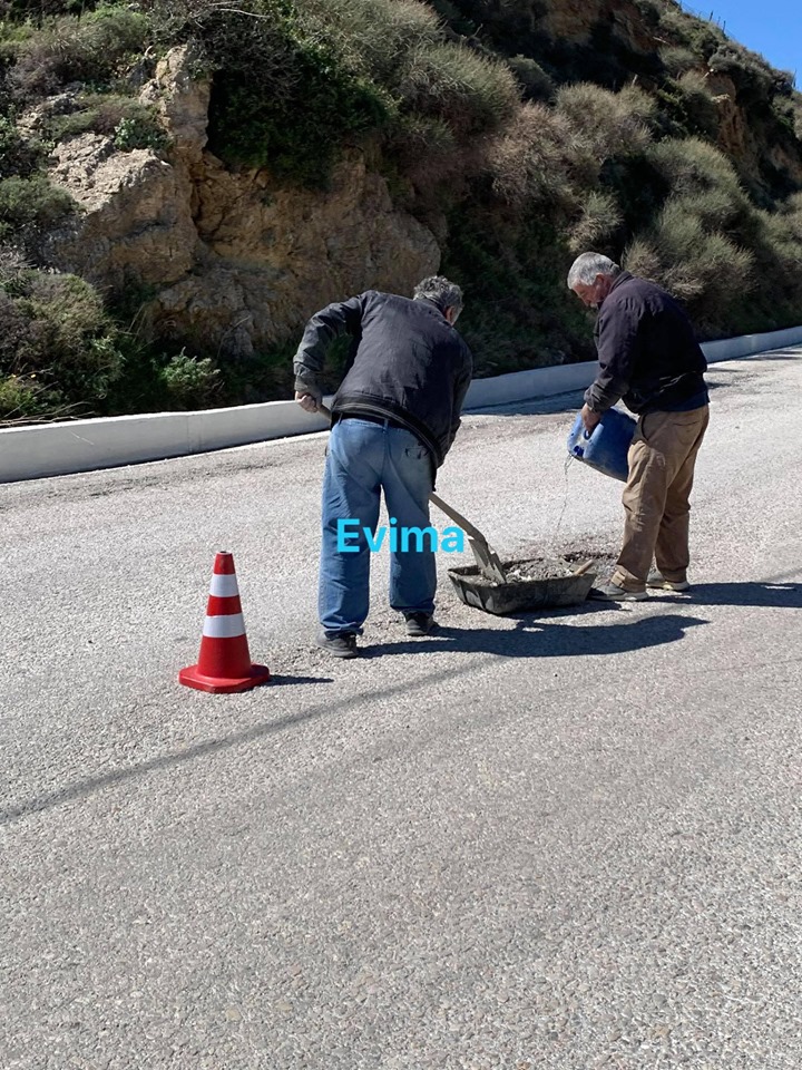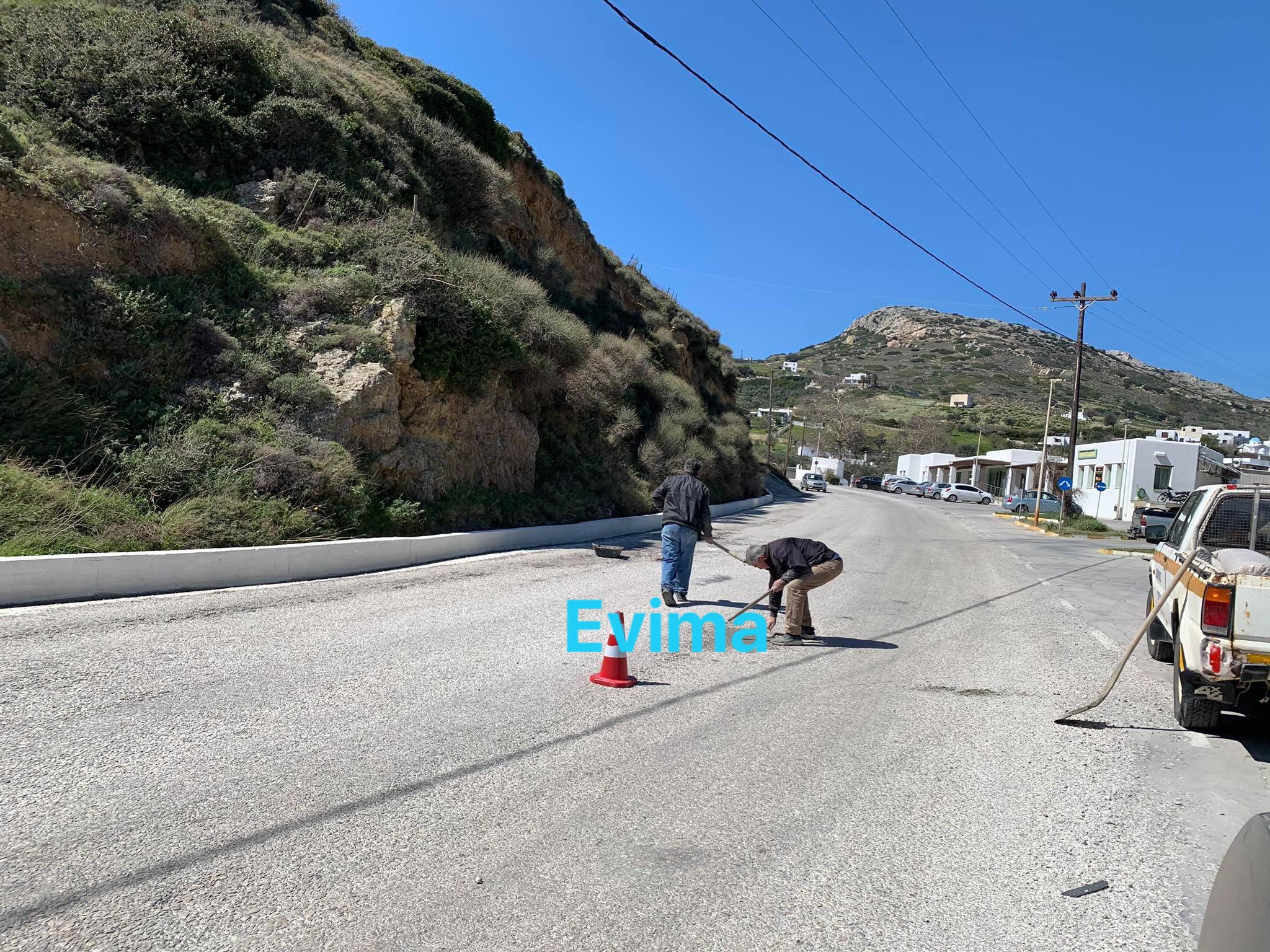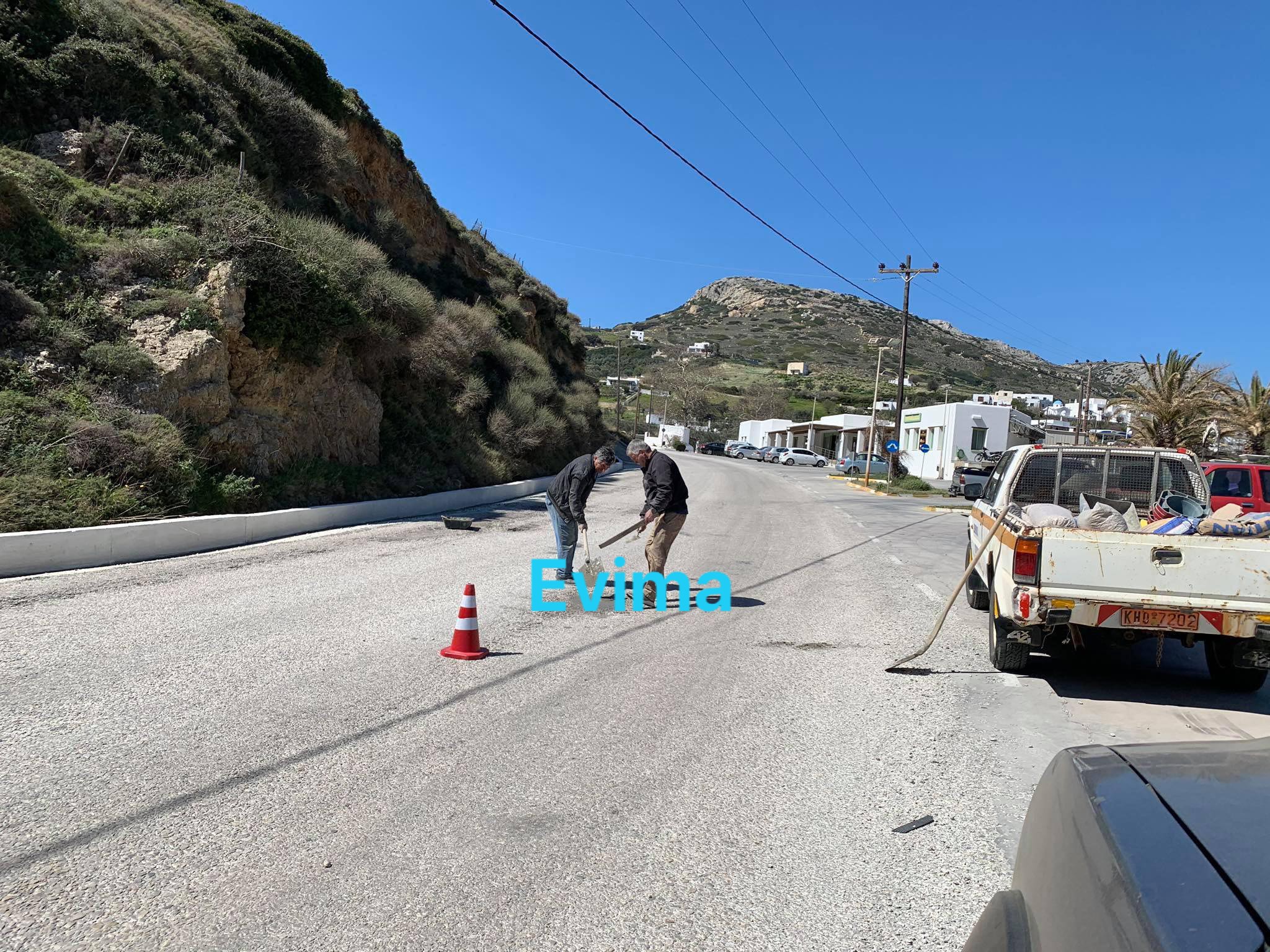 Από νωρίς το πρωί ο Στέλιος Βασιλάκος, Σταμάτης Λάμπρος και Γιώργος Μαλαματίνης κλείνουν αρκετές λακούβες στους δρόμους του νησιού φροντίζοντας για την καθημερινότητα των πολιτών. Έργα που για χρόνια είχαν μείνει πίσω, όπως δήλωσαν στο evima.gr