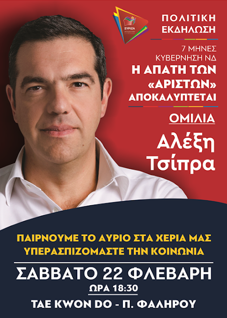 Το Σαββάτο 22 Φεβ. 2020, θα γίνει στην Αθήνα (Ταε κβο ντο) μεγάλη συγκέντρωση του ΣΥΡΙΖΑ, με ομιλητή τον σ. Πρόεδρο, Αλέξη Τσίπρα.