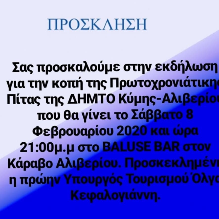 Στην εκδήλωση της κοπής πίτας που διοργανώνει η ΔΗΜΤΟ Κύμης Αλιβερίου θα παραστεί η Όλγα Κεφαλογιάννη.