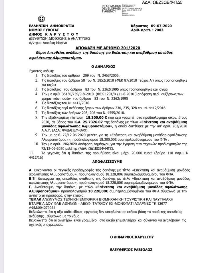 Με απόφαση του δήμαρχου Καρύστου προχωρά η επέκταση και αναβάθμιση της μονάδας αφαλάτωσης Αλμυροποτάμου [Έγγραφο]