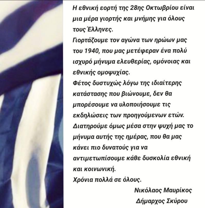 Το μήνυμα του δήμαρχου Σκύρου Νίκου Μαυρίκου για την Εθνική Επέτειο της 28ης Οκτωβρίου.