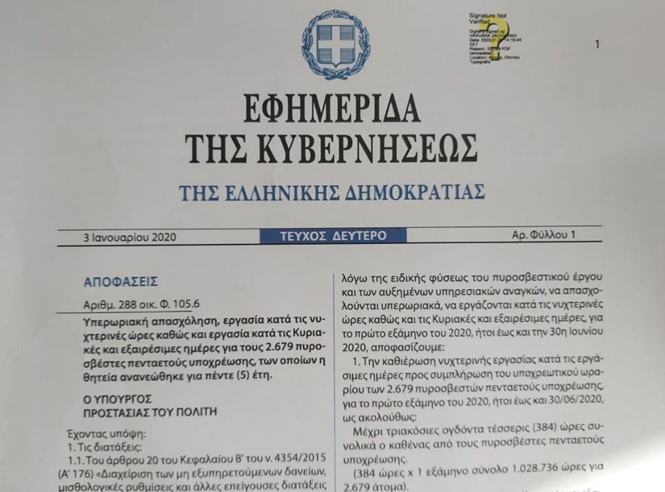 Μέσα σε 24 ώρες, και μετά την σχετική έγκριση του ΓΛΚ, ολοκληρώθηκε η Έκθεση Οικονομικής Επιβάρυνσης από το Τμήμα Προυπολογισμού του ΠΣ, η σχετική έκθεση-εισήγηση της Γενικής Διεύθυνσης Οικονομικού και Επιτελικού Σχεδιασμού (αριθ.πρωτ. ΓΔΟΕΣ/4/132) του Υπουργείου Προστασίας του Πολίτη, η εισήγηση της Διεύθυνσης Στρατηγικού Σχεδιασμου και της Ιεραρχίας προς εμέ για την σύνταξη σχεδίου Υπουργικής Απόφασης, η σύνταξη του σχετικού ενημερωτικού και σχεδίου Απόφασης προς τον Υπουργό (αριθ. Πρωτ. 288 οικ.Φ.105.6), η διαδικασία υπογραφής από τον κο Υπουργό, η έκδοση απόφασης ανάληψης υποχρέωσης της σχετικής δαπάνης στον Προυπολογισμό της Γενικής Γραμματείας Πολιτικής Προστασίας, η ηλεκτρονική αίτηση πρός το Εθνικό Τυπογραφείο και η ανάληψη ΚΑΔ (αρ.176), η αποστολή προς την ΓΓ Νομικών θεμάτων για έλεγχο νομιμότητας και η μολις πριν λίγο σημερινή έκδοση του σχετικού ΦΕΚ 1Β/3-1-2020!