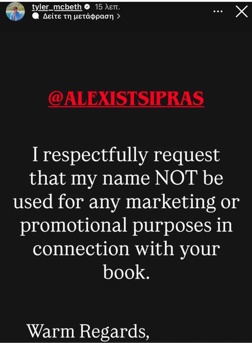 Το story του Τάιλερ Μακμπέθ με το οποίο απευθύνεται στον Αλέξη Τσίπρα