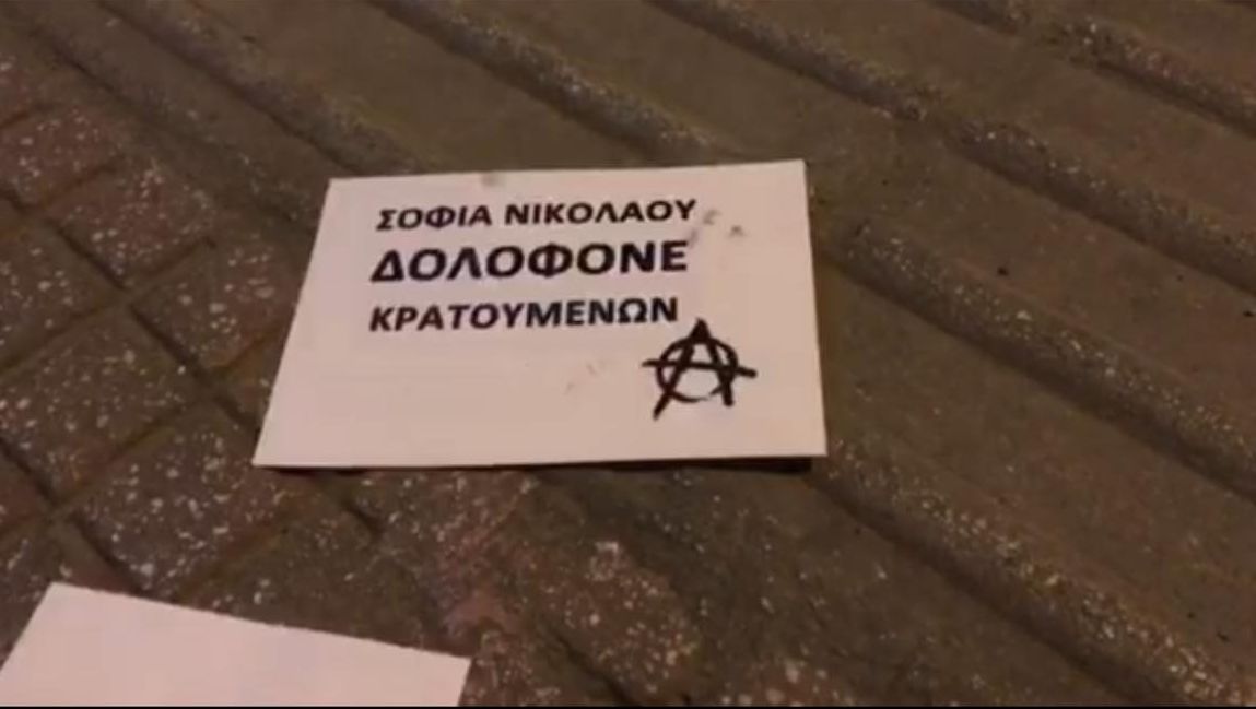 Άγνωστοι πέταξαν τρικάκια  έξω από το γραφείο της Γενικής Γραμματέως Αντεγκληματικής Πολιτικής, Σοφίας Νικολάου στις 20:40 το βράδυ της Κυριακής.