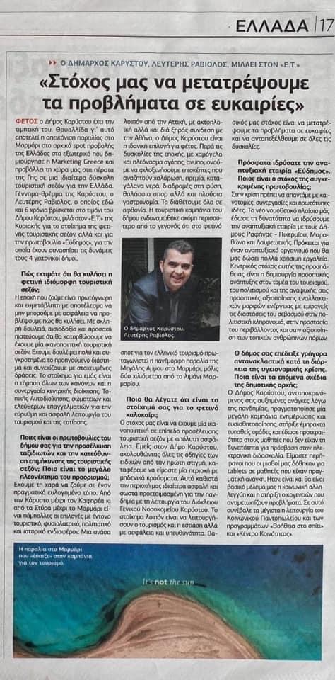 Για το στοίχημα της φετινής τουριστικής σεζόν μίλησε στην εφημερίδα Ελεύθερος Τύπος ο δήμαρχος Καρύστου. Ο Λευτέρης Ραβιόλος μετά και την μεγάλη προώθηση του Δήμου μέσω του σποτ του υπουργείου Τουρισμού με την παραλία της Μεγάλης Άμμου στο Μαρμάρι, δήλωσε πως στόχος του Δήμου είναι μα μετατρέψει τα προβλήματα σε ευκαιρίες.