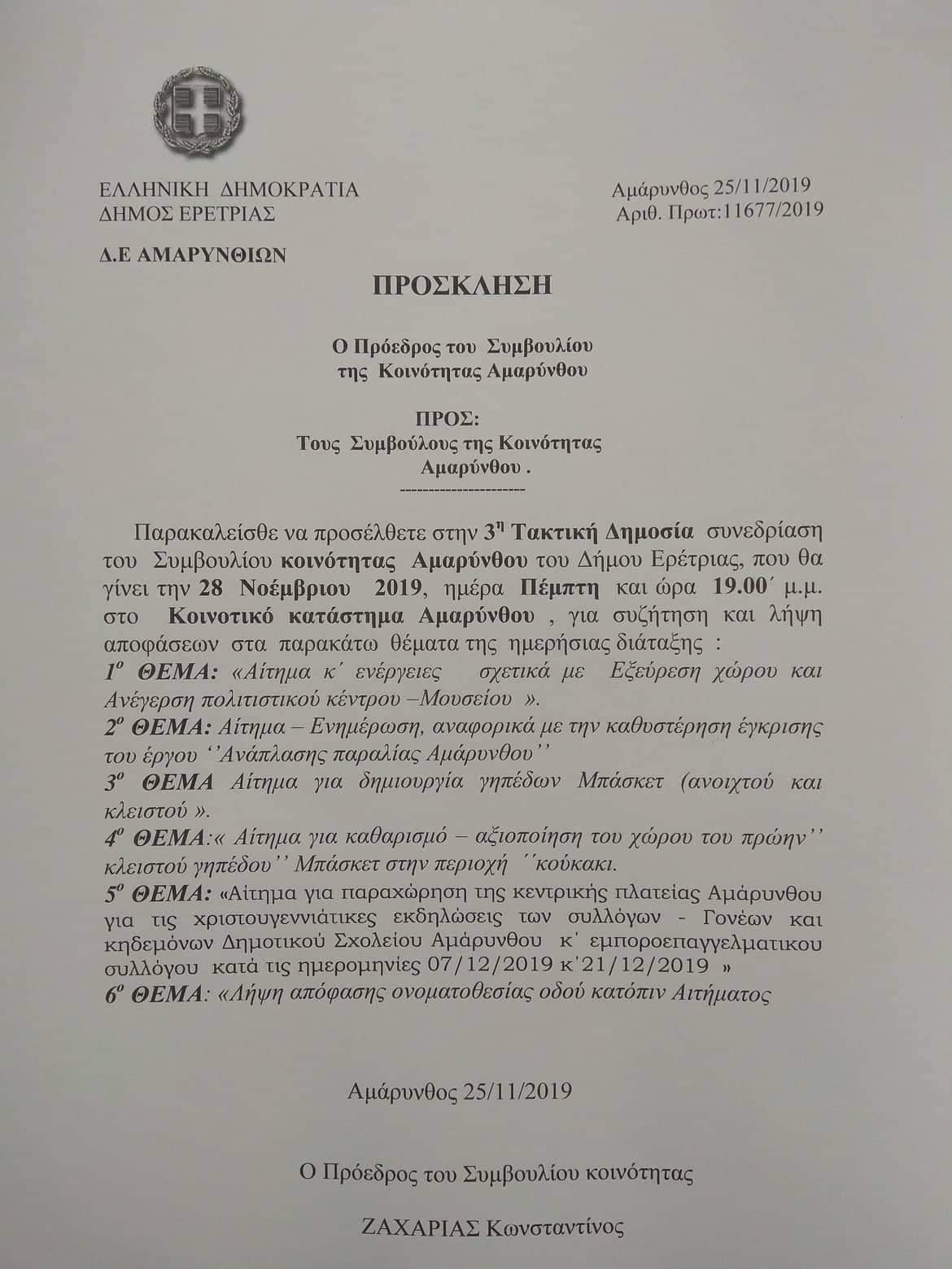 Συνεδρίασε σήμερα το απόγευμα το συμβούλιο της Κοινότητας Αμαρύνθου υπό τον πρόεδρο Κώστα Ζαχαριά.