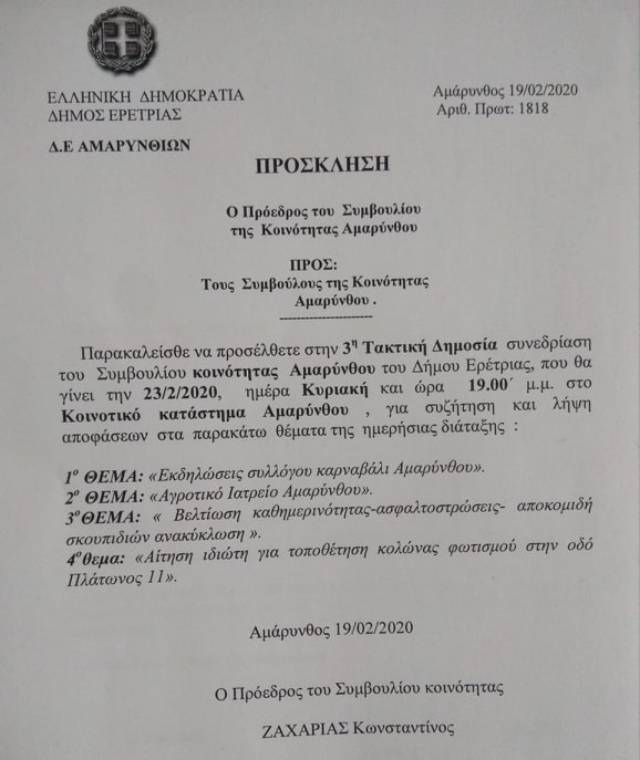 Συνεδριάζει την Κυριακή 23 Φεβρουαρίου το συμβούλιο της Κοινότητας Αμαρύνθου στις 19.00 μ.μ. στο Κοινοτικό Κατάστημα Αμαρύνθου.