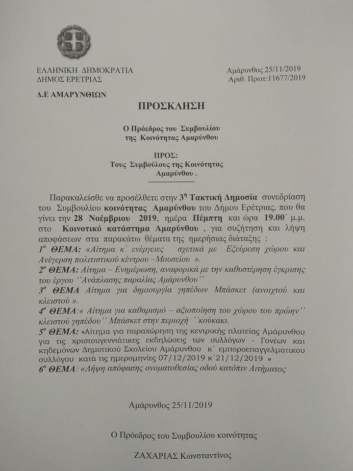 Την Πέμπτη 28 Νοεμβρίου θα πραγματοποιηθεί η 3η Τακτική Δημόσια Συνεδρίαση του Κοινοτικού Συμβουλίου Αμαρύνθου.