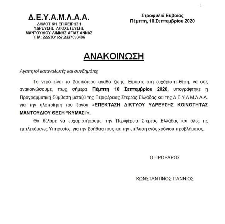 Μετά από 35 χρόνια προσπαθειών το Κυμάσι Μαντουδίου θα έχει πόσιμο νερό. Υπογράφτηκε χθες η προγραμματική σύμβαση μεταξύ της Περιφέρειας Στερεάς Ελλάδας και της ΔΕΥΑΜΛΑΑ λύνοντας το χρόνιο αυτό πρόβλημα στην συγκεκριμένη περιοχή.
