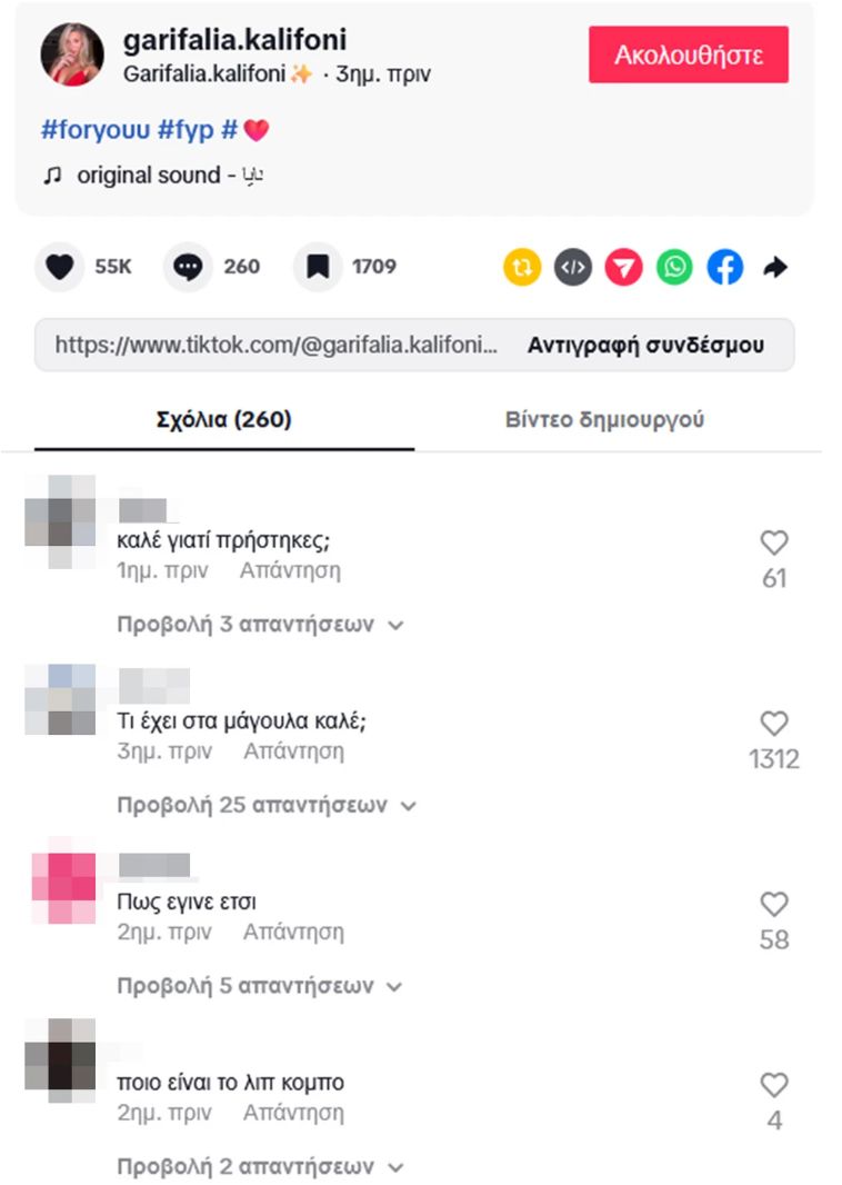 Στο συγκεκριμένο βίντεο, αρκετοί χρήστες στάθηκαν στο πρόσωπό της και ειδικά στα μάγουλά της. Κάποιοι υποστήριξαν ότι δείχνει πρησμένη και άλλοι ότι έχει βάλει υαλουρονικό στο πρόσωπό της.