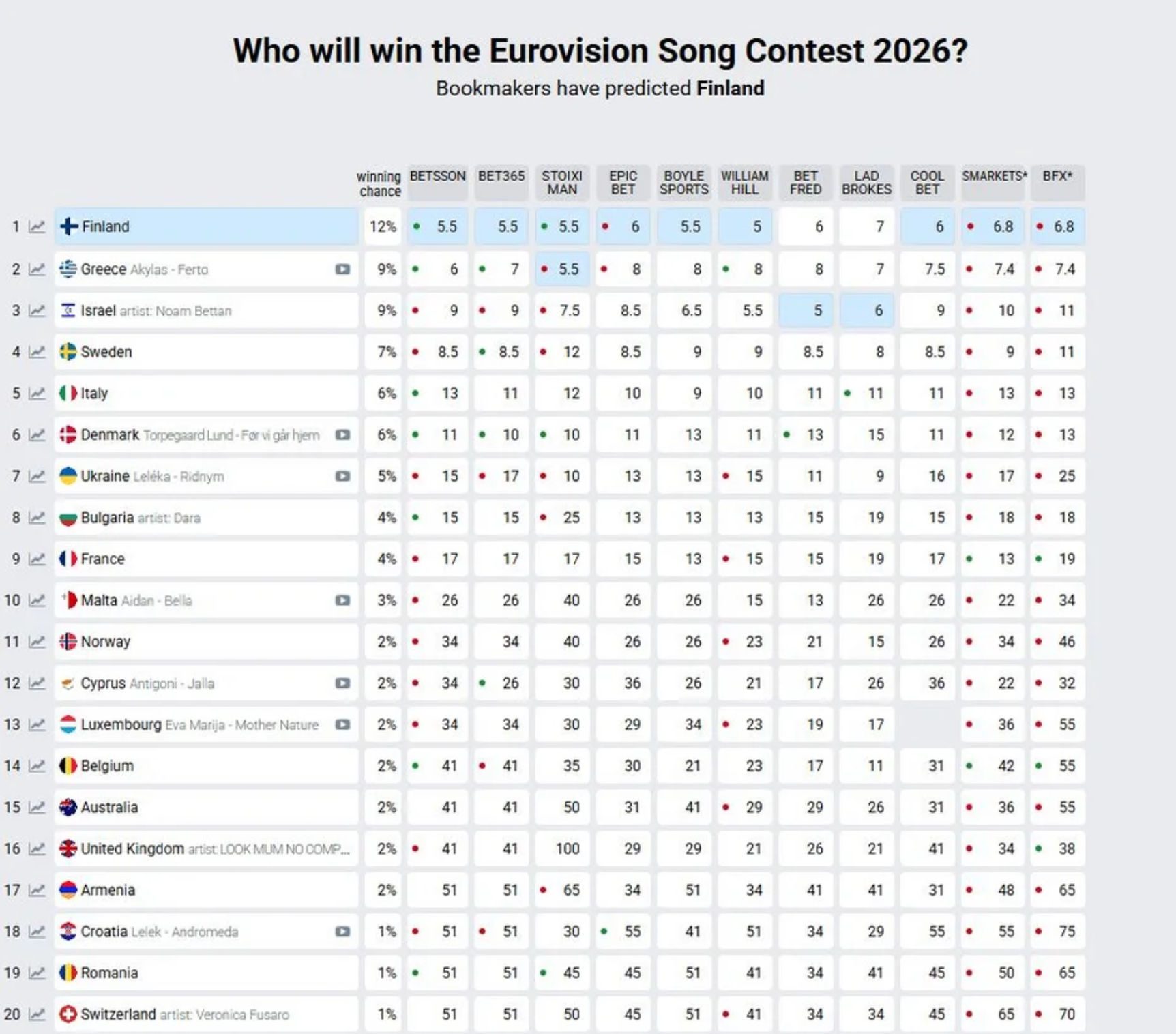 Όπως μπορεί να δει κανείς στον πίνακα με το σύνολο των στοιχηματικών εταιρειών, η Ελλάδα έχει περάσει το Ισραήλ, το οποίο βρίσκεται στην τρίτη θέση παρόλο που δεν έχει ανακοινώσει ακόμη το τραγούδι του. Στην πρώτη θέση βρίσκεται η Φινλανδία, η οποία επίσης δεν έχει ακόμη επιλέξει το τραγούδι που θα την εκπροσωπήσει.