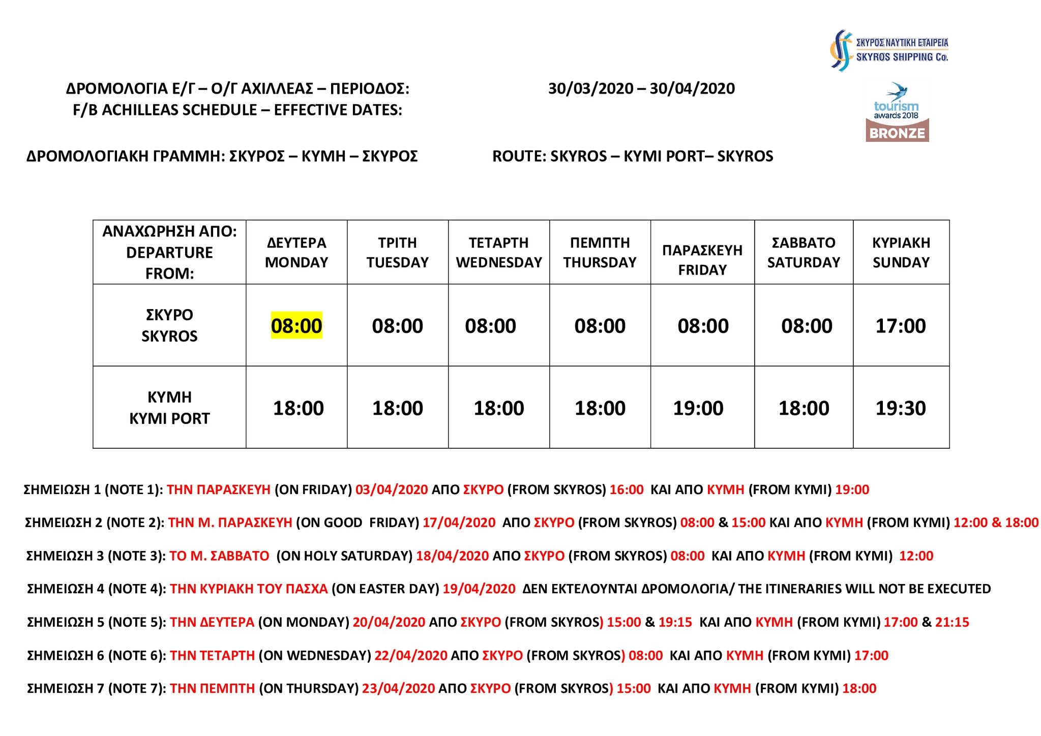 ΝΕΑ ΔΡΟΜΟΛΟΓΙΑ ανακοίνωσε η Σκύρος Ναυτική Εταιρεία κατά τη χρονική περίοδο 30/03/2020 – 30/04/2020