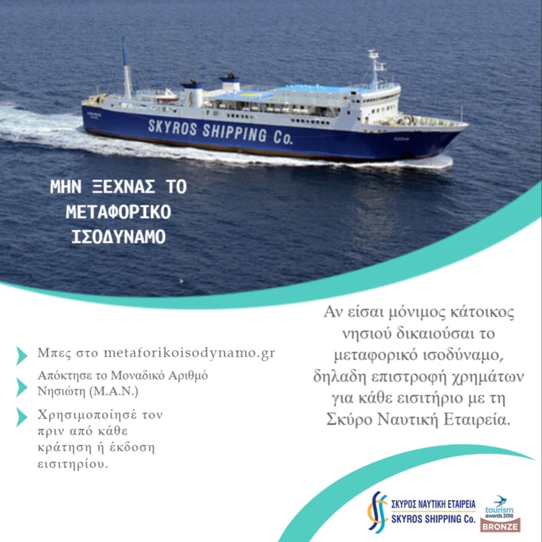 Η Σκύρος Ναυτική Εταιρεία συμμετέχει στο “Μεταφορικό Ισοδύναμο”, το μέτρο που έχει θεσπίσει το Υπουργείο Ναυτιλίας και Νησιωτικής Πολιτικής, δίνοντας τη δυνατότητα στους νησιώτες να επιδοτούνται για τις μετακινήσεις τους.