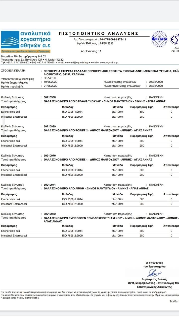 Γιάννης Τριανταφύλλου:Πριν από μερικές ημέρες λάβαμε το Πιστοποιητικό Ανάλυσης θαλασσίων υδάτων από το Λιμεναρχείο Λίμνης.