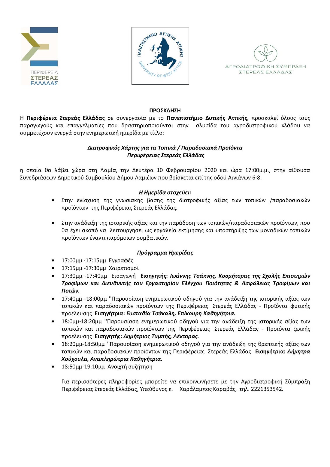 Πρόσκληση σε Ημερίδα στη Λαμία-Διατροφικός Χάρτης για τα Τοπικά-Παραδοσιακά Προϊόντα Περιφέρειας Στερεάς Ελλάδας