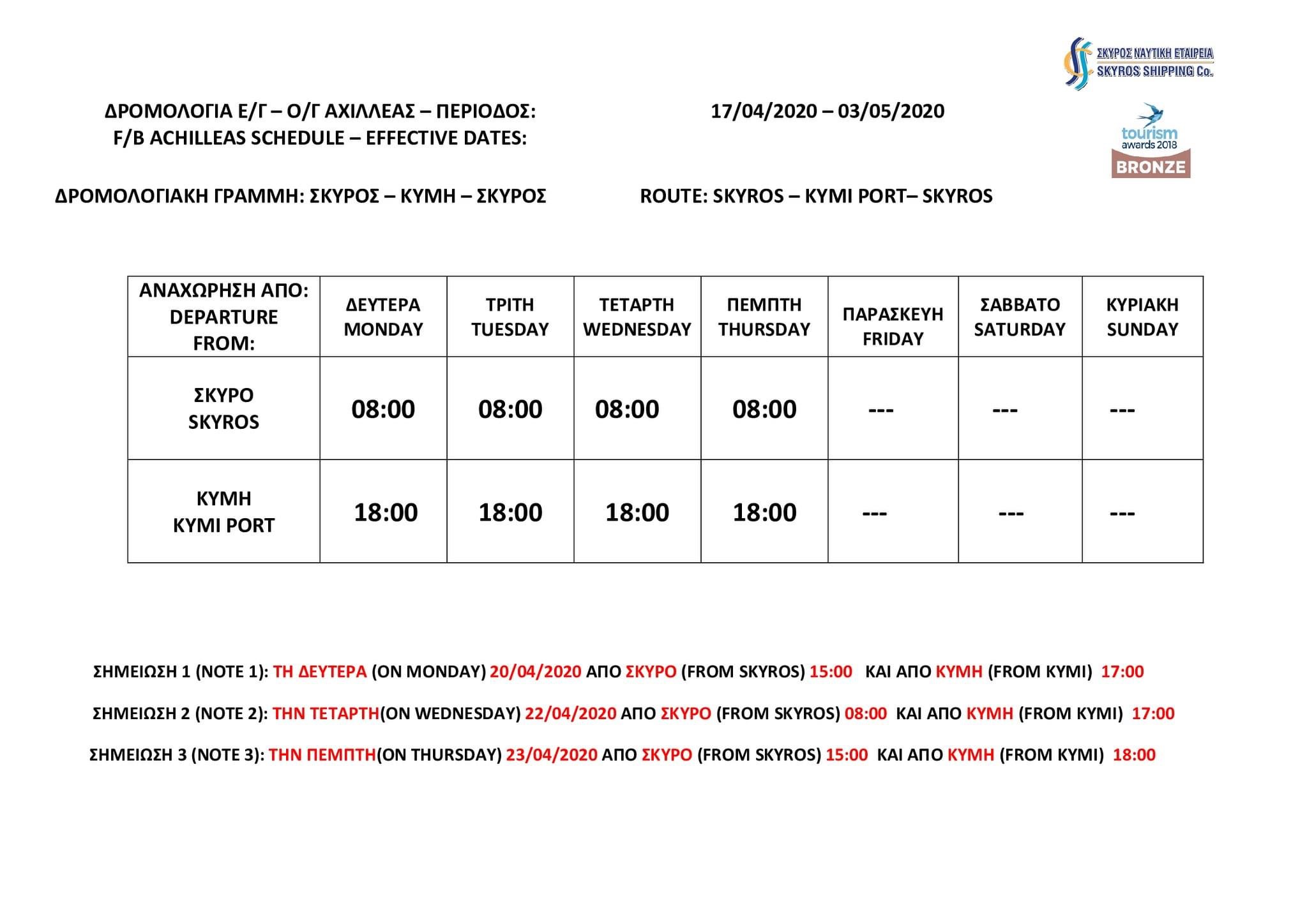 Όπως ανακοίνωσε η Σκύρος Ναυτική Εταιρεία αυτά είναι τα νέα δρομολόγια από 17/04/2020 – 03/05/2020 στη γραμμή