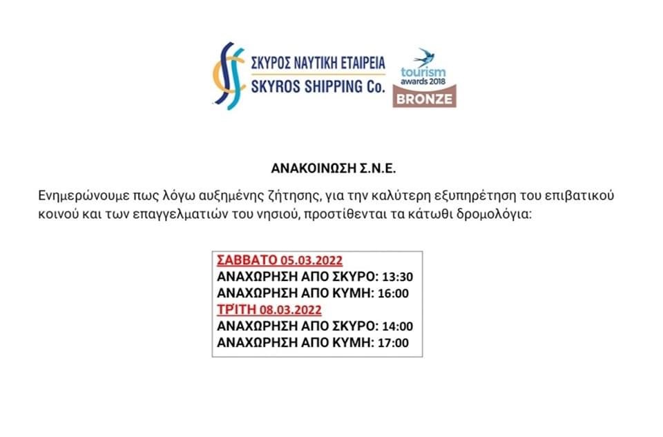 Λόγω της αυξημένης ζήτησης η Σκύρος Ναυτική Εταιρία ανακοινώνει τα νέα δρομολόγια του πλοίου Αχιλλέας.