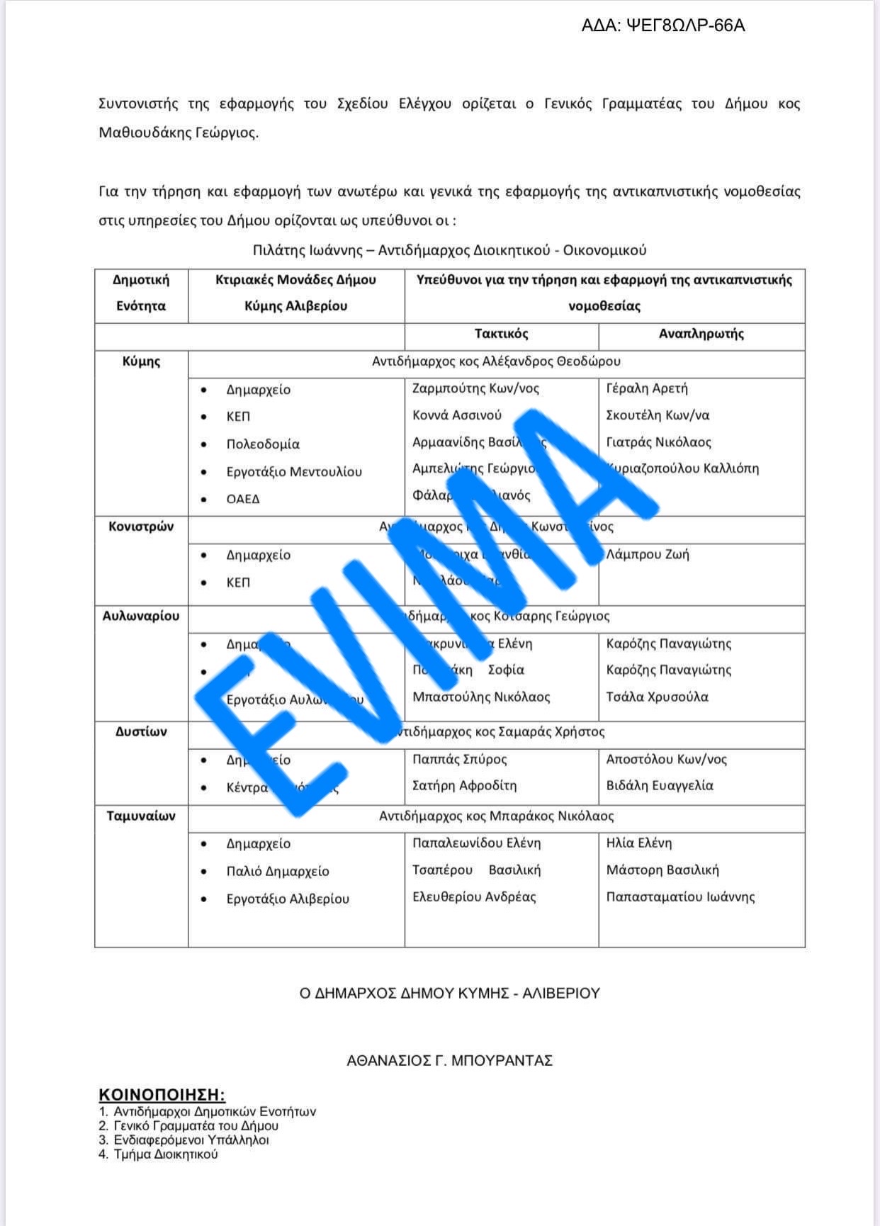 Με απόφαση του δημάρχου Κύμης Αλιβερίου Θανάση Μπουραντα ορίστηκαν οι υπεύθυνοι της εφαρμογής για τον αντικαπνιστικό νόμο σε όλες τις ενότητες του Δήμου.