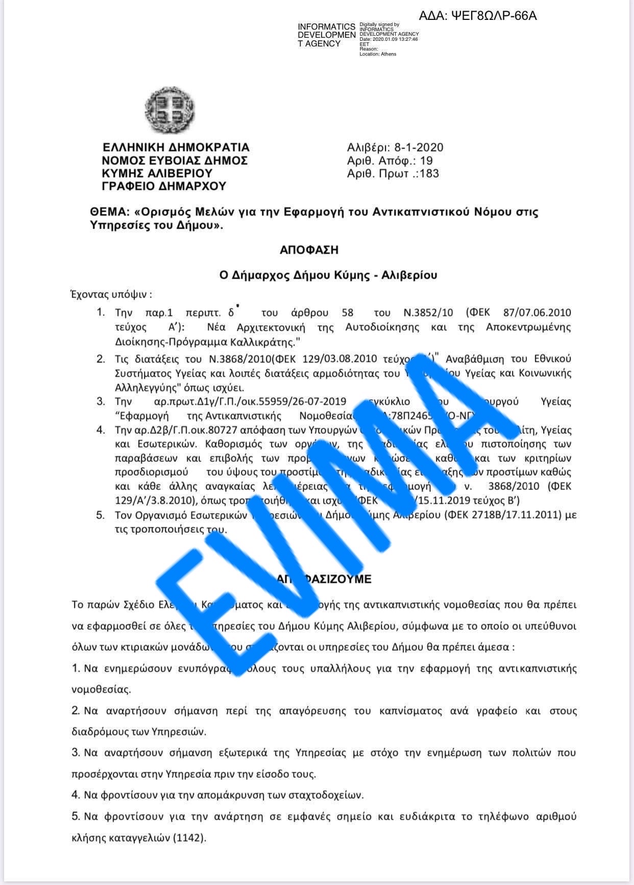 Αυτοί είναι οι υπεύθυνοι εφαρμογής του αντικαπνιστικού νόμου στον Δήμο Κύμης Αλιβερίου-Δείτε το έγγραφο