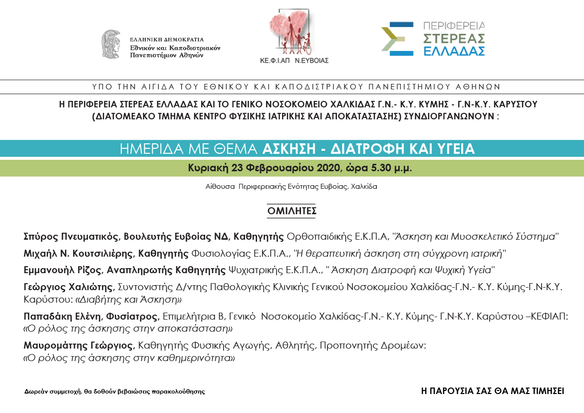 Η Περιφέρεια Στερεάς Ελλάδας σε συνεργασία με το διατομεακο τμήμα του Νοσοκομείου Χαλκίδας, ΚΕΦΙΑΠ (Κέντρο Φυσικής Ιατρικής και Αποκατάστασης) υπο την αιγίδα του Ε.Κ.Π.Α.συνδιοργανώνουν την ημερίδα Άσκηση -Διατροφή και υγεία.