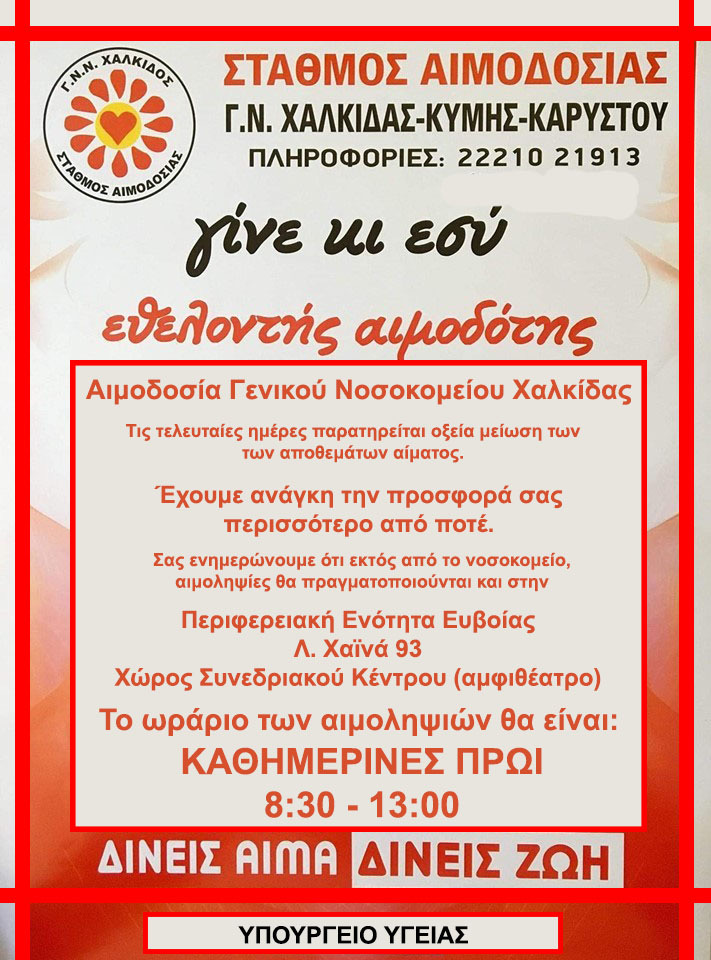 Ξεκίνησε σήμερα το πρωί η αιμοδοσία στην αίθουσα του Αμφιθεάτρου της Π.Ε. Εύβοιας. Εθελοντική αιμοδοσία που συνδιοργάνωσε η Π.Ε. Εύβοιας και το Γ.Ν.Χαλκίδος. Παρών ήταν ο αντιπεριφερειάρχης της Π.Ε. Εύβοιας Γιώργος Κελαιδίτης, οι αντιπεριφερειάρχες Κωνσταντίνος Γαλάνης και Ηλίας Μπουρμάς και ο Δημήτρης Βουρδάνος.