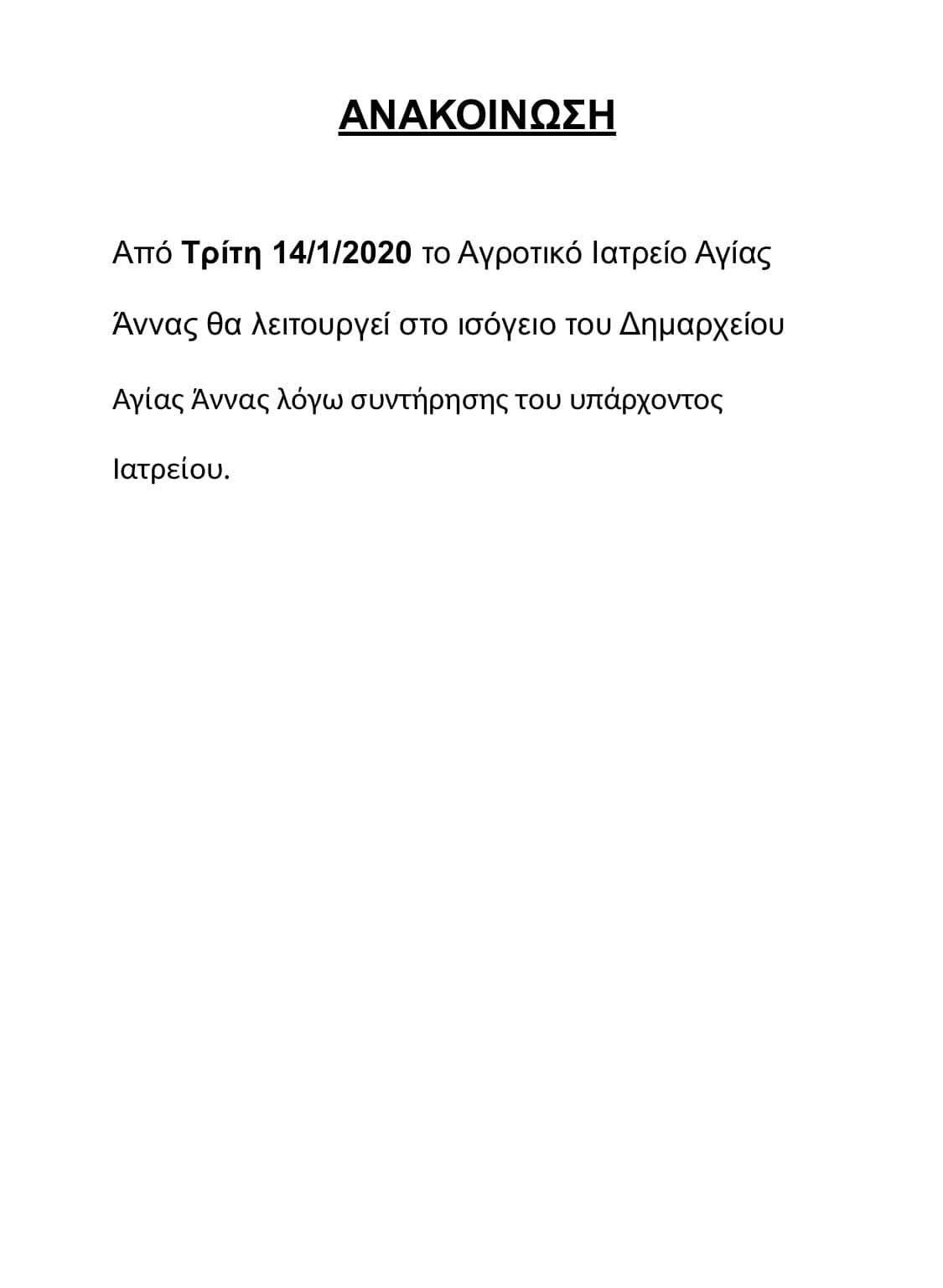 Από Τρίτη 14/01/2020 το Αγροτικό Ιατρείο Αγίας Άννας θα λειτουργεί στο ισόγειο του Δημαρχείου Αγίας Άννας λόγω συντήρησης του υπάρχοντος Ιατρείου.